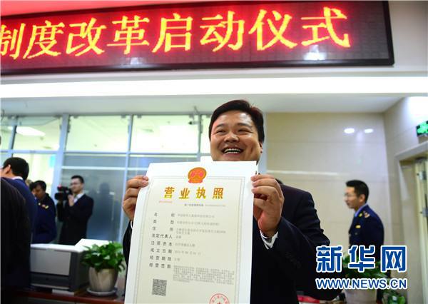 2015年10月8日,華創智庫大數據科技有限公司法人代表姜鏹領取吉林省首張“五證合一”營業執照。新華社記者 林宏 攝