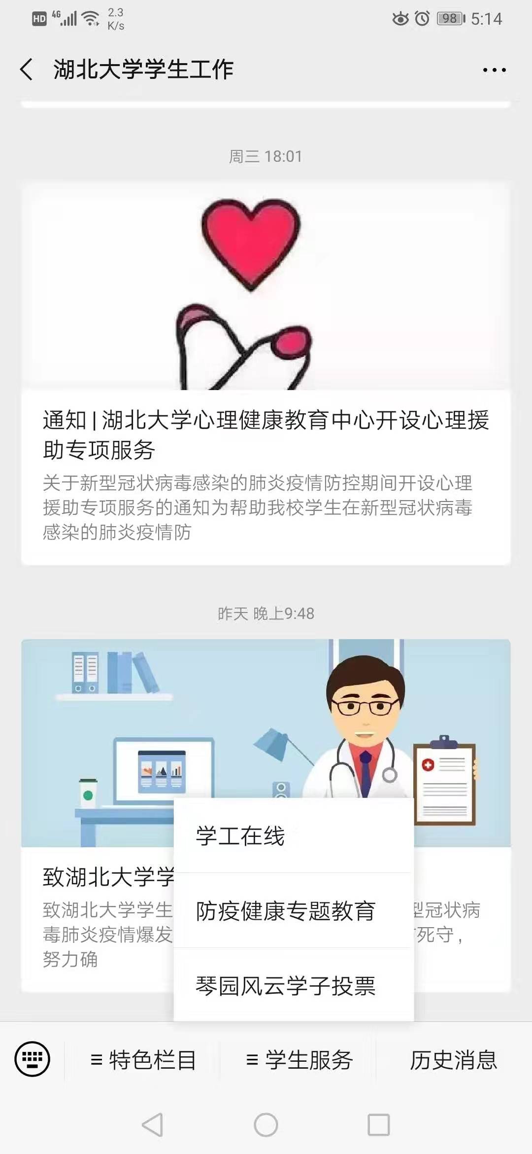 登陸方式一:關注“湖北大學學生工作”微信公眾號(或掃描以下二維碼關注)點擊菜單欄【學生服務】--【防疫健康專題教育】。