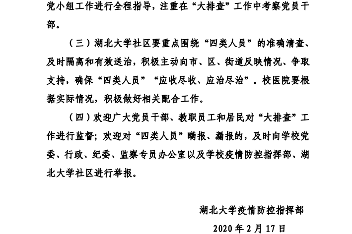 來源:湖北大學(xué)疫情防控指揮部 作者: 編輯:鮮文濤 時間:2020-02-17 字號: 【大】 【中】 【小】