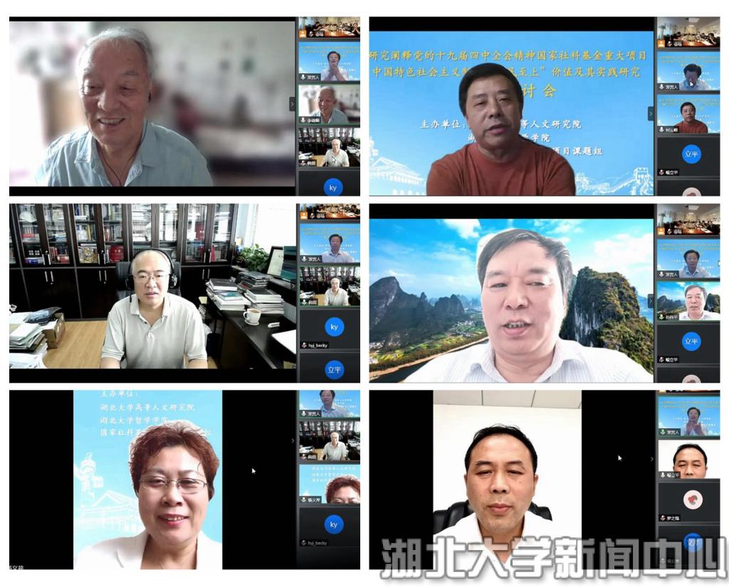 7月10日, 國(guó)家社科基金“研究闡釋黨的十九屆四中全會(huì)精神”重大項(xiàng)目“中國(guó)特色社會(huì)主義制度‘人民至上’價(jià)值及其實(shí)踐研究”舉行開(kāi)題研討會(huì)。會(huì)議采取線(xiàn)上線(xiàn)下相結(jié)合的形式進(jìn)行,湖北省社會(huì)科學(xué)界聯(lián)合會(huì)黨組書(shū)記喻立平、中國(guó)政法大學(xué)終身教授李德順、北京師范大學(xué)韓震教授等國(guó)內(nèi)七名專(zhuān)家學(xué)者通過(guò)視頻方式出席會(huì)議并發(fā)言。我校校長(zhǎng)謝紅星出席會(huì)議現(xiàn)場(chǎng)并致辭。