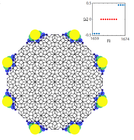 最近,一類新的拓撲絕緣體-高階拓撲絕緣體(Higher-Order Topological Insulators)被提出并且引起了研究熱潮。與先前的拓撲絕緣體相比,該類拓撲絕緣體表現出完全不同的體態-邊界態對應關系。以二維為例,通常的拓撲絕緣體具有一維無能隙邊界態,而二階拓撲絕緣體擁有無能隙的零維拐角態(Corner States)?,F有的高階拓撲絕緣體都需要晶體對稱性的拓撲保護,那么是否存在超越現有框架的高階拓撲絕緣體呢?該研究團隊發現在二維準晶中存在一類截然不同的高階拓撲絕緣體,它受到一種晶體所不具有的,八重旋轉對稱性的保護,邊界上具有八重對稱性的無能隙拐角態(如圖所示),是一類新的對稱性保護的拓撲物態。