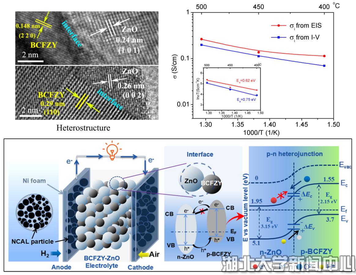 為了充分利用BCFZY在低溫下的優(yōu)勢(shì)并消除其電子電導(dǎo)的負(fù)面影響,朱斌教授團(tuán)隊(duì)提出了pn異質(zhì)結(jié)構(gòu)電解質(zhì)的想法,即通過引入n型半導(dǎo)體ZnO與p型半導(dǎo)體BCFZY構(gòu)建異質(zhì)結(jié)構(gòu)復(fù)合電解質(zhì),利用體異質(zhì)結(jié)促進(jìn)離子的運(yùn)輸并且阻擋電子的導(dǎo)通,從而實(shí)現(xiàn)電解質(zhì)功能。研究發(fā)現(xiàn),所制備的BCFZY-ZnO電解質(zhì)具有大量的異相界面,應(yīng)用于低溫SOFC后能夠?qū)崿F(xiàn)理想的開路電壓和輸出功率,排除了電子的短路問題。通過對(duì)交流阻抗譜和極化曲線的分析,研究發(fā)現(xiàn)該材料具有優(yōu)異的混合質(zhì)子/氧離子電導(dǎo)率(500℃達(dá)到0.20 S/cm)。基于對(duì)兩種半導(dǎo)體在SOFC氣氛下導(dǎo)電類型以及能級(jí)位置的測(cè)試,研究團(tuán)隊(duì)從能帶理論的角度分析了電解質(zhì)中體異質(zhì)結(jié)內(nèi)建電勢(shì)對(duì)離子運(yùn)輸?shù)拇龠M(jìn)機(jī)制以及對(duì)電子的阻擋作用。這一研究成功地將離子導(dǎo)電型半導(dǎo)體整合到SOFC的電解質(zhì)層中,為發(fā)展高性能的低溫電解質(zhì)提供了一個(gè)全新的思路。該項(xiàng)工作依托于物電學(xué)院“鐵電壓電材料與器件”湖北省重點(diǎn)實(shí)驗(yàn)室,得到國(guó)家自然科學(xué)基金的資助。